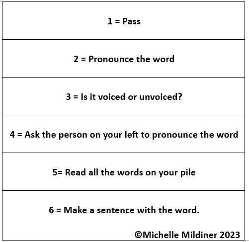 If they throw a 5, (Read all the words on your pile) they must put back any words that they mispronounce. Don’t be too strict on this one, the main thing is to get a good approximation of the ‘th’ sound and for there to be no major errors.